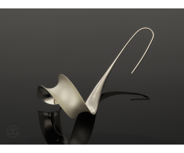 Ohrhänger TUBE erinnert in seiner schwungvollen Form an einen trompetenförmigen Blütenkelch. Durch den Kontrast aus mattierter und polierter Oberfläche entfaltet der Ohrschmuck eine umvergleichliche Dynamik. Der antiklastisch geschmiedete Anhänger wird in gelbgold, roségold und weißgold in vielen Stunden Handarbeit gefertigt. Tube kann als einzelner Ohrhänger einseitig oder auch als Paar getragen werden.