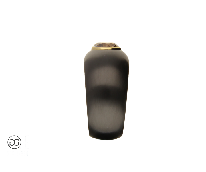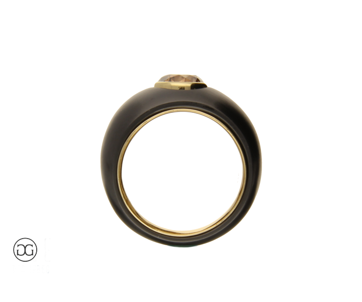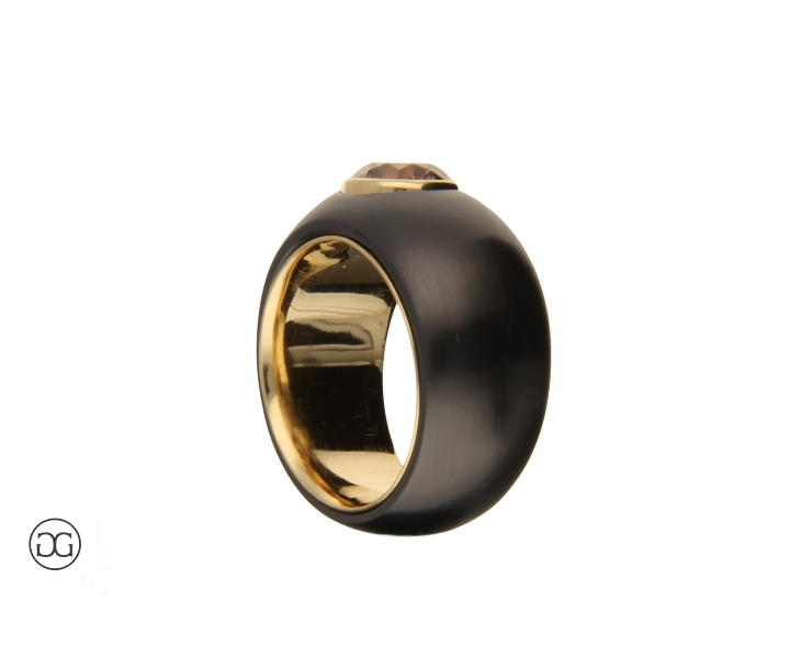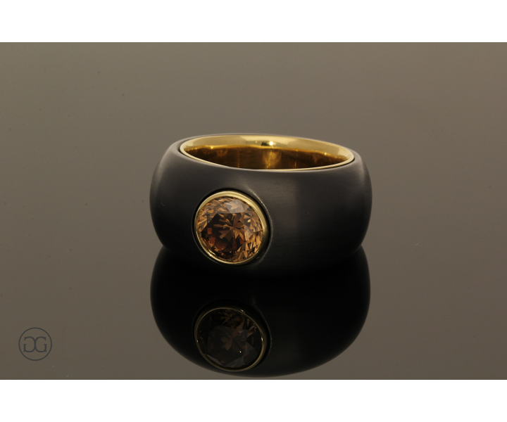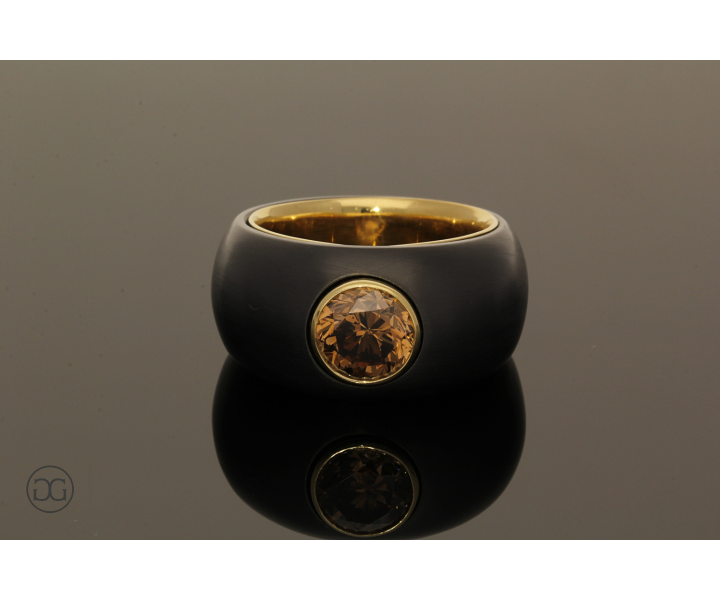 Feinstes Gelbgold in Hochglanzpolitur wird hierbei ganz bewusst in Kontrast mit geschwärztem Stahl gesetzt. Diese interessante Kombination dieser beiden so unterschiedlichen Materialien sowie die spielerischen Effekte zwischen polierten und mattierten Oberflächen verleihen diesem Ring einen Hauch von schlichter Eleganz und moderner Weiblichkeit. Der wunderschöne cognacfarbene Diamant im Brillantschliff rundet dabei diesen edlen Gesamteindruck farblich ab.