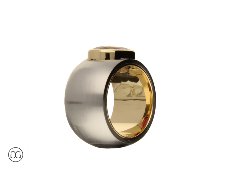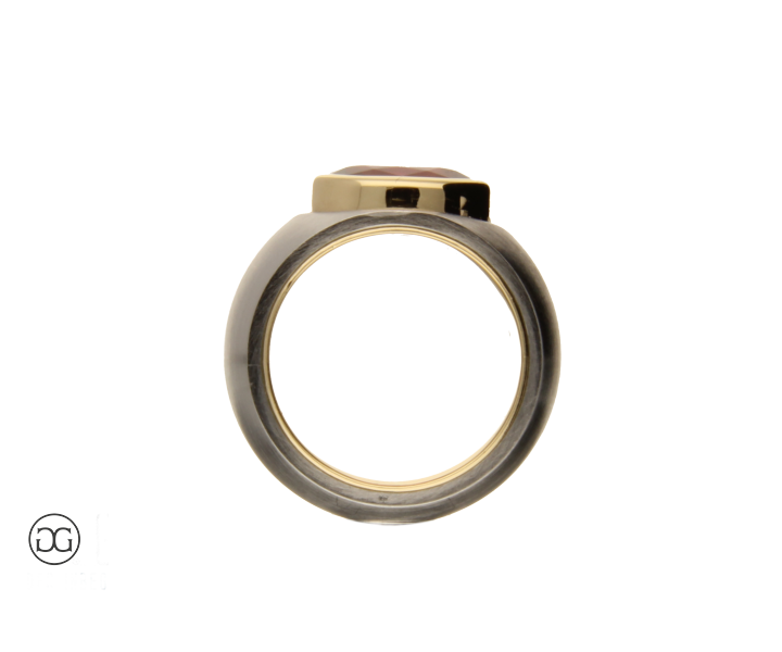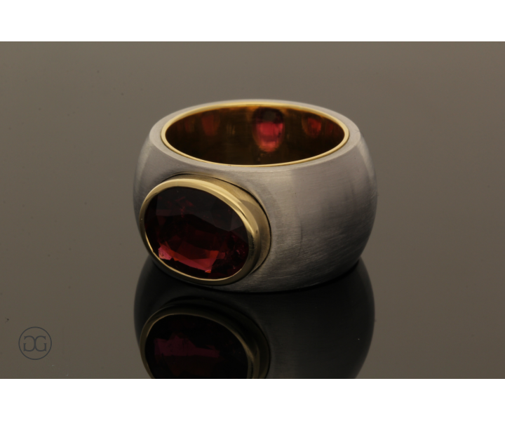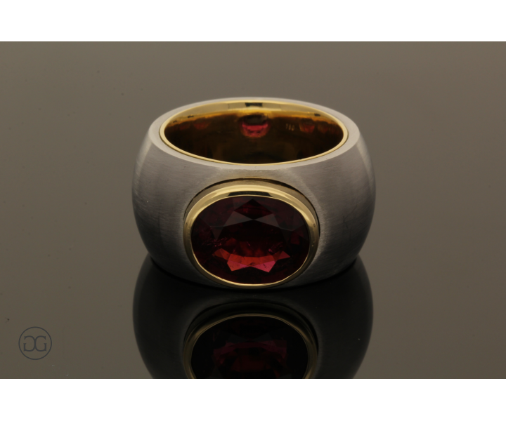 Feinstes Gelbgold in Hochglanzpolitur wird hierbei ganz bewusst in Kontrast mit mattiertem Stahl gesetzt. Diese interessante Kombination dieser beiden so unterschiedlichen Materialien sowie die spielerischen Effekte zwischen polierten und mattierten Oberflächen verleihen diesem Ring einen Hauch von schlichter Eleganz und moderner Weiblichkeit. Der wunderschöne rosarote Turmalin im facettierten Ovalschliff rundet dabei diesen edlen Gesamteindruck farblich ab.