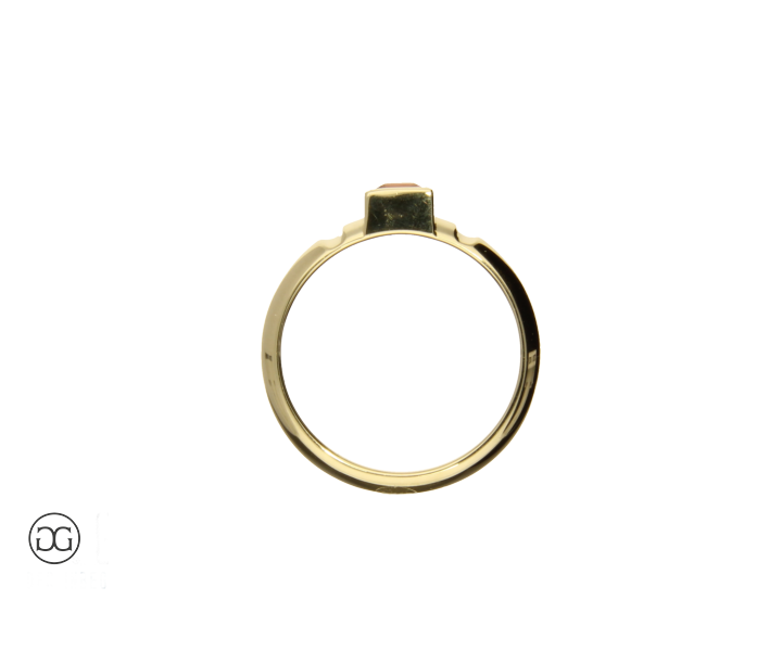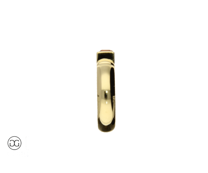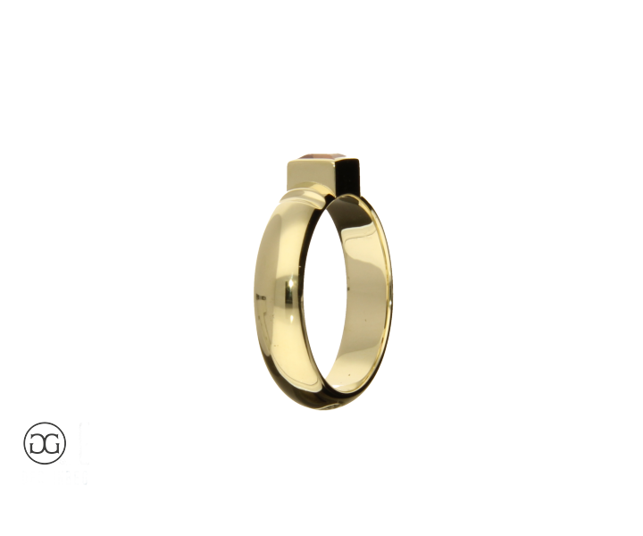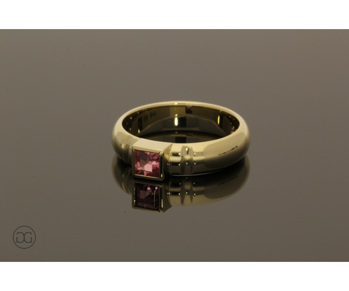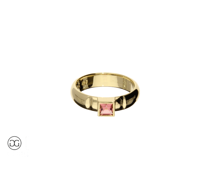 Edles Gelbgold in Hochglanzpolitur und ein wunderschöner rosafarbener Turmalin im Carreeschliff verleihen diesem edlen Ring einen Hauch von schlichter Eleganz.