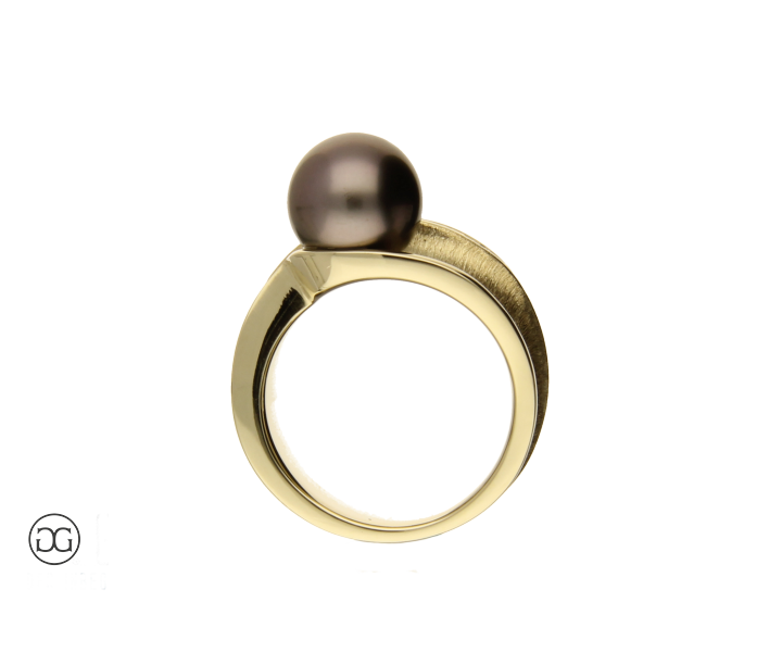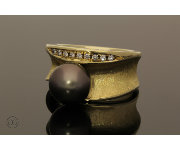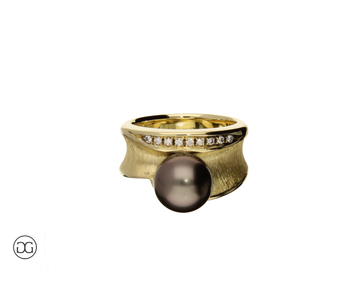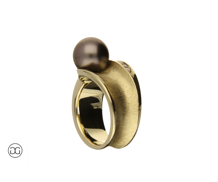 Edles Gelbgold, eine wunderschöne, naturfarbene Tahiti-Zuchtperle und hochwertige Brillanten verleihen diesem unverwechselbaren Schmuckstück einen Hacuh von schlichter Eleganz und moderner Weiblichkeit.