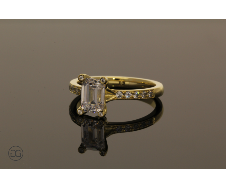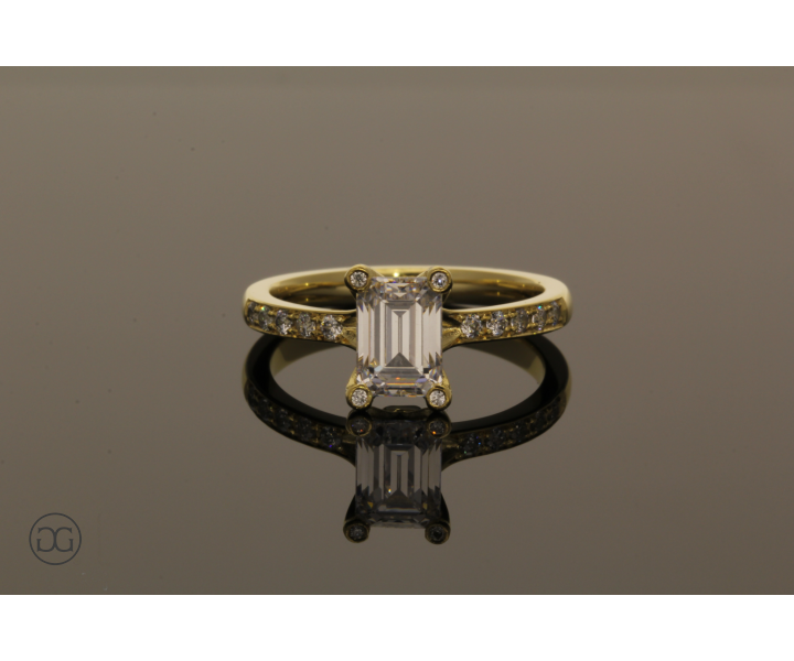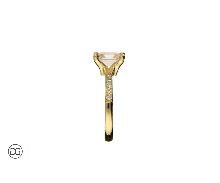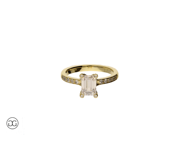 Die klare Linienführung, feinstes Gelbgold in Hochglanzpolitur und wunderschöne, hochwertige Diamanten im Smaragd- und Brillantschliff verleihen diesem Ring einen Hauch von glamuröser Eleganz.