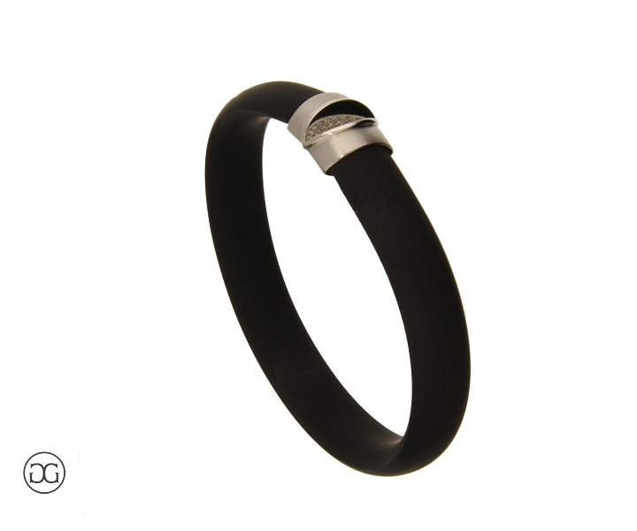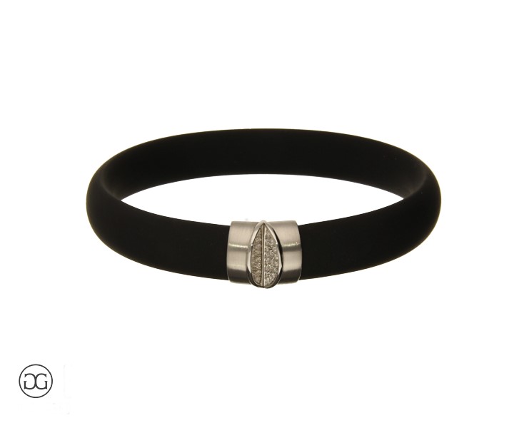 Von erlesener Qualität ist dieser schlichte Kautschuk Armreif mit einem raffinierten Verschluss in 950 Platin. In Pavè gefasste Brillianten runden das edle Stück ab.