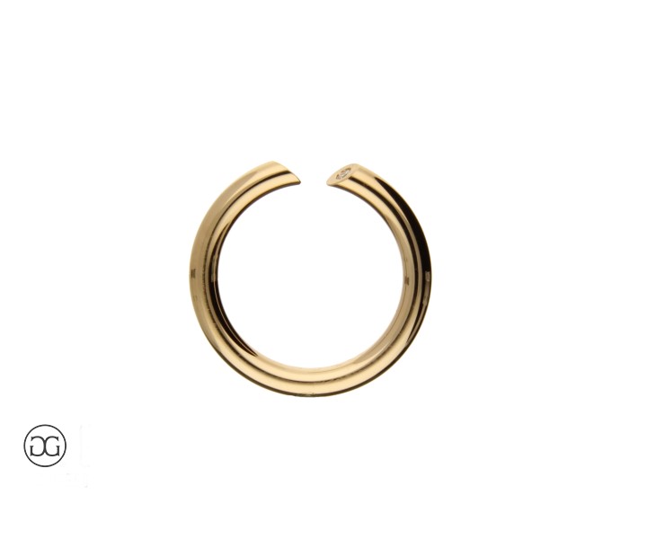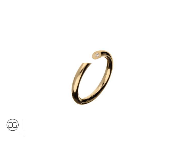 Ein Rosegold Damenring in schlichtem und modernem Design: Offene Ringschiene mit Rundprofil und abgeschrägten Seiten in die jeweils ein Brilliant eingerieben wurde.