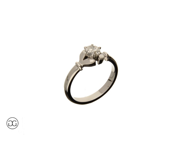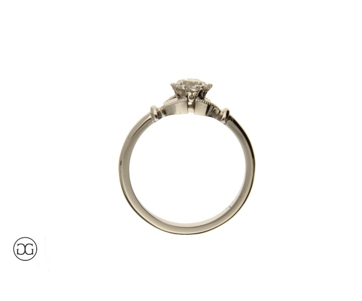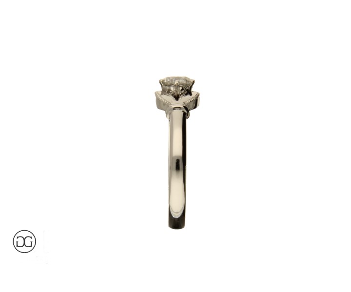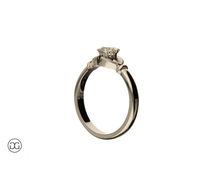 Romantischer Verlobungsring in 950 Platin, zwei Blätter mit Milgriffrand halten den Brillianten in einer 6 Krappenfassung.