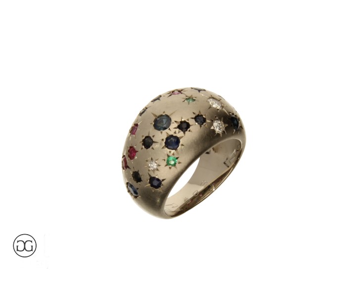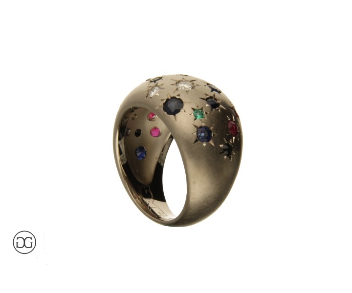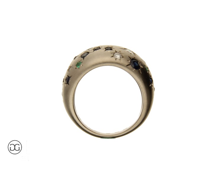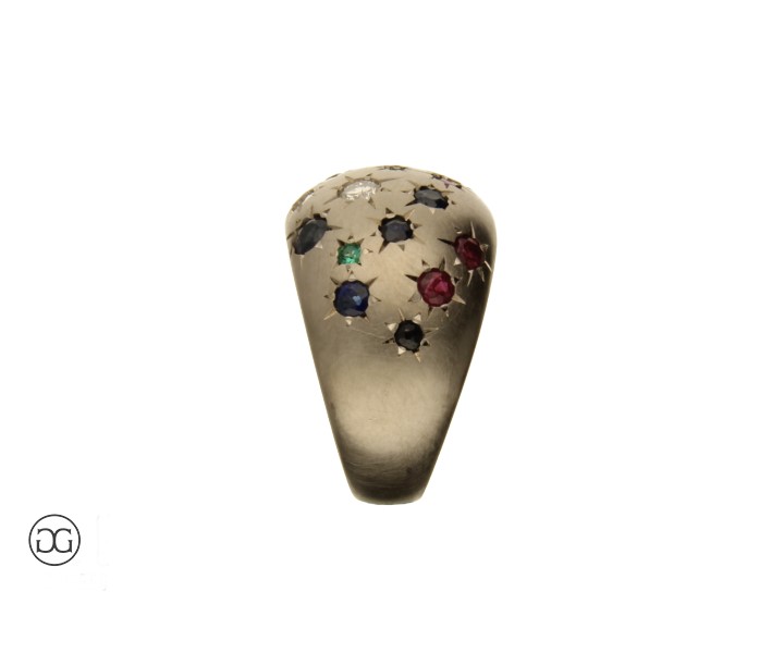 Dieser außergewöhnliche Damenring in Weißgold wurde nach einer Fotografie von einem verlorenen Stück neu angefertigt. Die verschiedenen, bunten Farbsteine stammen teilweise aus dem Besitz der Kundin und wurden nur von uns ergänzt. In den Sternchenfassungen bringen sie den Ring zum strahlen.