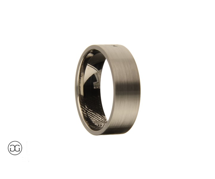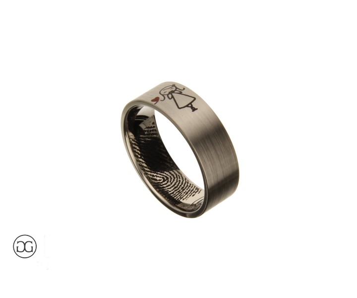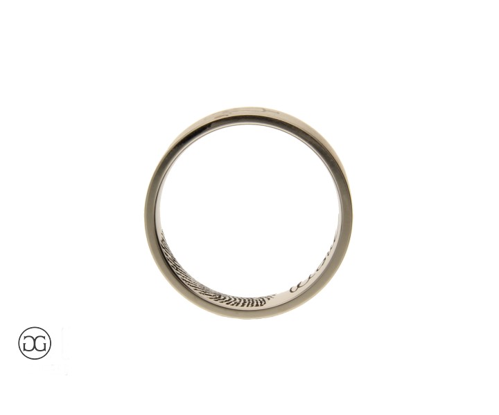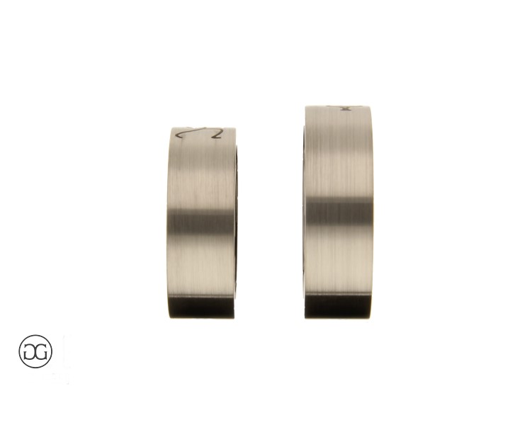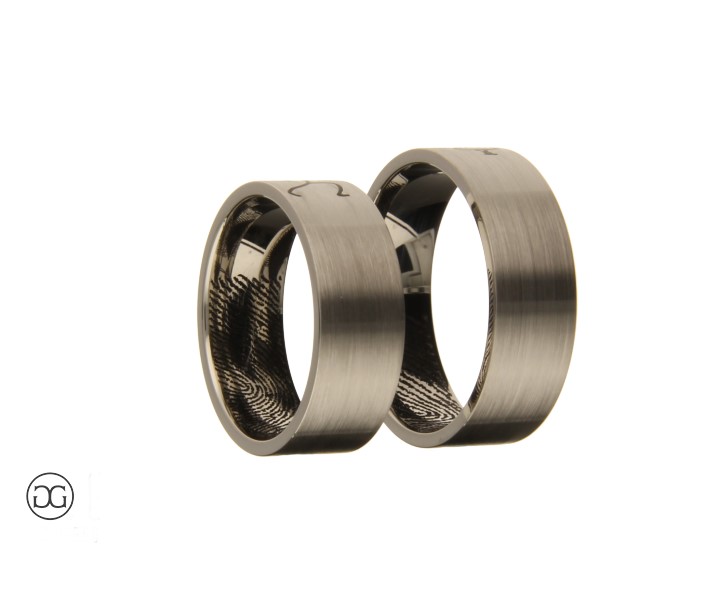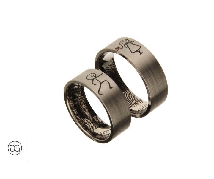 Trauringe in Platin 600, Oberflläche streifenmatt, flache Form, innen bombiert. Individuell nach Kundenwunsch graviert, außen mit Figuren, innen mit Fingerprint- und Handschriftgravur