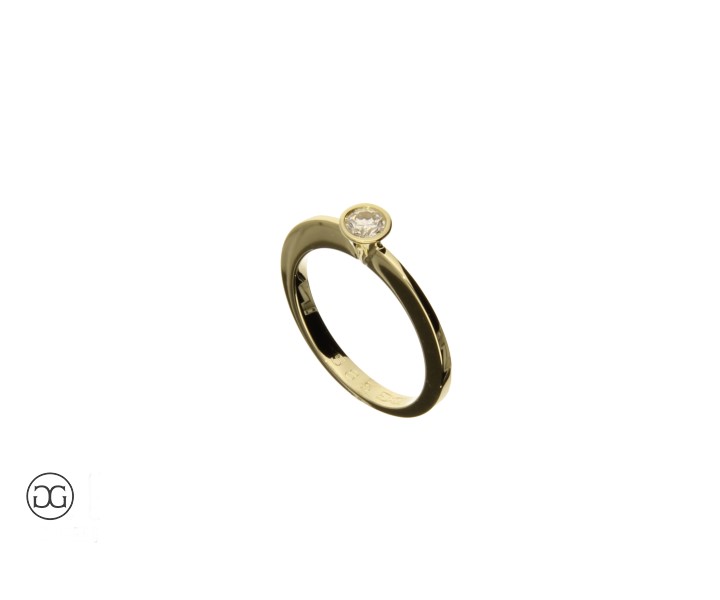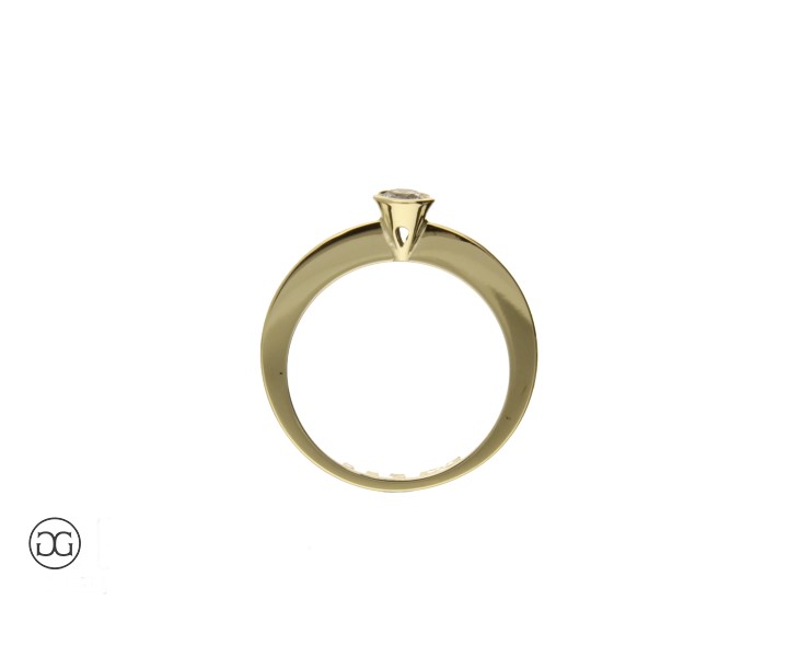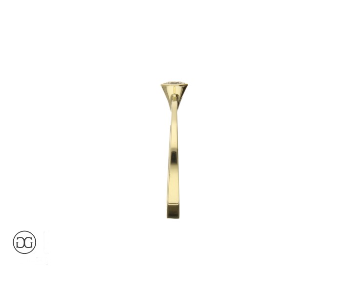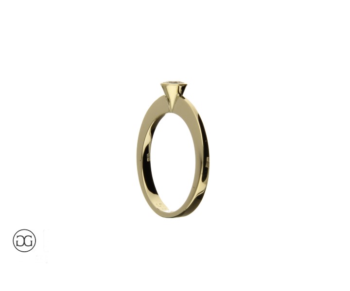 Gelbgold Verlobungsring in moderner, geometrischer Form, mit konischer Zargenfassung auf Ringschiene mit Verlauf, Innenseite graviert.