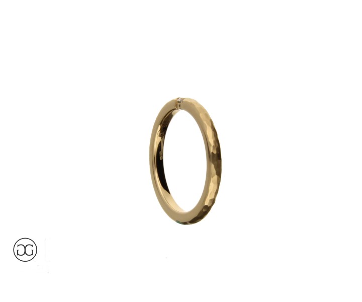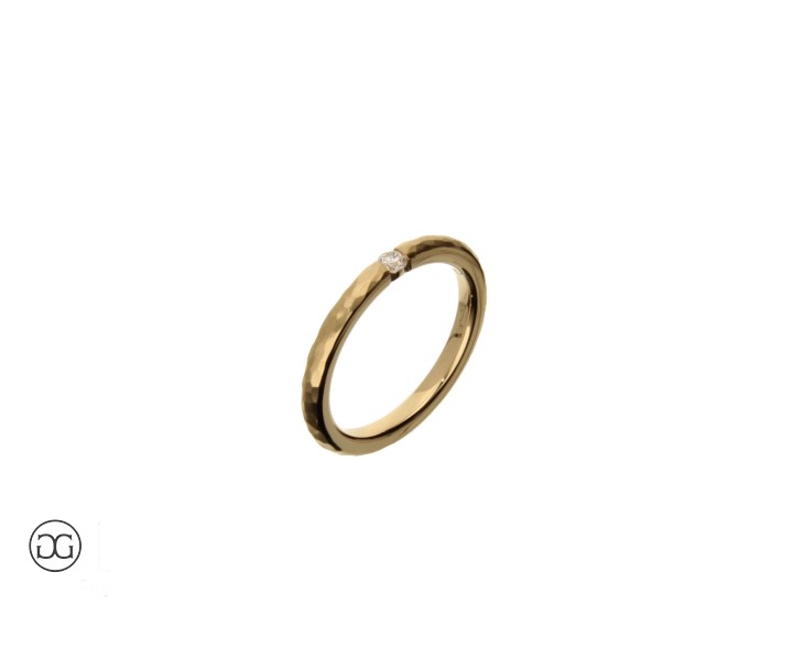 Wer es sportlich und elegant mag, wird diesen formreduzierten, schlichten Verlobungsring in Rosegold lieben. Der Hammerschlag ist eine besonders haltbare Oberfläche, die auch bei täglichem tragen wenig Gebrauchsspuren zeigt. Der 0,06ct Brilliant wurde auf Spannung eingefasst.